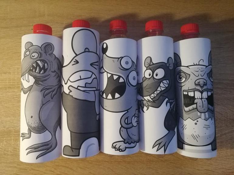 Новогодний боулинг. На пол литровые бутылки из-под колы наклеила страшные картинки крысок: