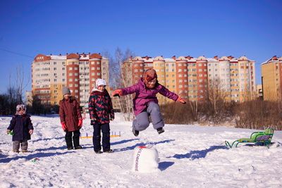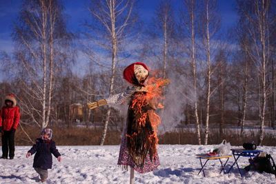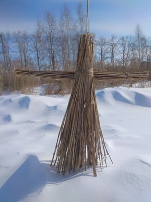 - Снег растопили, через костер попрыгали, а теперь прощаемся с зимой, зажигаем чучело! (Ведущий напоминает правила безопасности и следит за их выполнением)