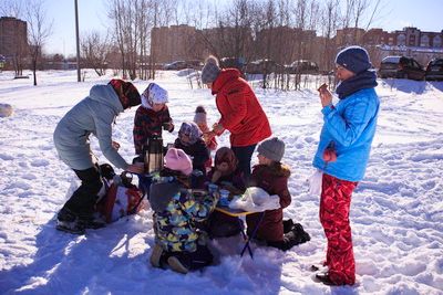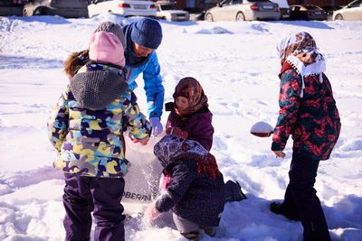 - Мне понадобится 2 человека. Ваша задача этими лопатками набрать пакет снега (Остальные участники придерживают пакет за ручки. Кто желает, может помогать насыпать снег руками. После этого пакет завязывается и на него приклеивается изображение костра).