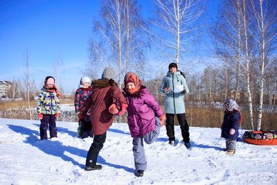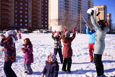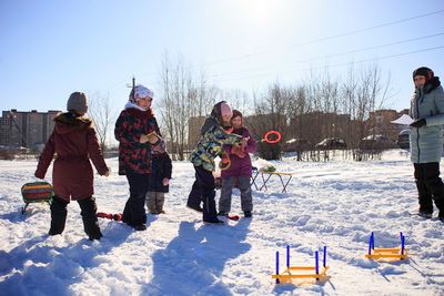 - На Масленицу было принято кататься на санях, запряженных в тройку лошадей. Мне понадобится 4 человека (3 коня и 1 наездник). Сейчас «кони» будут катать наездника по дороге вот на этих санях, объезжая препятствия, и в обратную сторону. Чтобы наездник чувствовал себя в поездке комфортно, «коням» нужно вести его дружно. Потом будем меняться ролями.