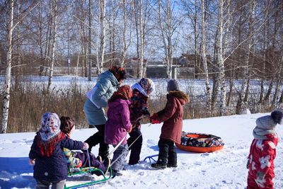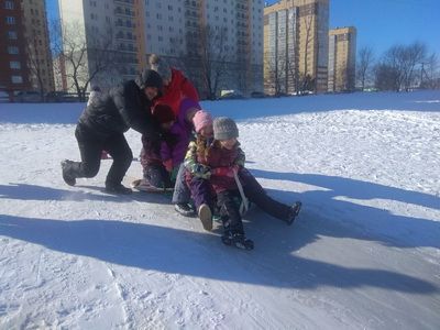 (Дети разбирают плюшки, ледянки, санки и идут кататься с горы)