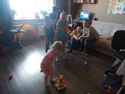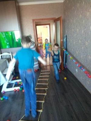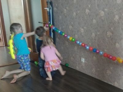 (В комнате примотана к двум стульям на расстоянии друг от друга лента широкого скотча клейкой стороной к детям и разбросаны шарики от сухого бассейна.)