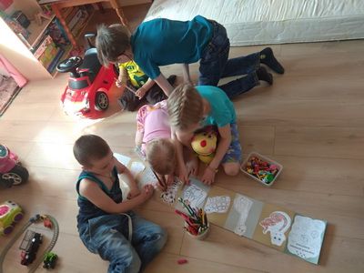 - Все фотографии в дневнике черно-белые. Вы можете помочь сделать их цветными. Те из вас, кто захотят раскрасить наших животных, могут остаться здесь. Остальные могут самостоятельно поиграть, попрыгать, побросать колечки…