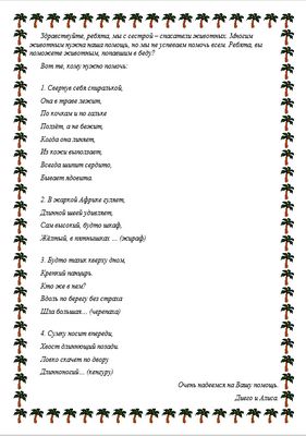 - Это письмо от Диего и Алисы. Они пишут: «Здравствуйте, ребята, мы с сестрой - спасатели животных. Многим животным нужна наша помощь, но мы не успеваем помочь всем. Ребята, вы поможете животным, попавшим в беду?»