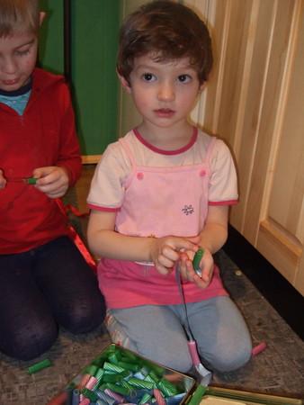 И не видела не слышала своих сокровищ минут 15-20. Егор с Алинкой нанизывали бусины на ленточки, а Кирочка просто с удовольствием рылась руками в коробке и разбрасывала бусины по кухне.