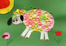 Теперь овечку надо приодеть. Для этого из цветной бумаги нарезают полоски (размеры зависят от самой овечки), скручивают их, чтобы получились завитушки, а затем, обмазав тело овечки клеем, приклеивают разноцветные колечки.