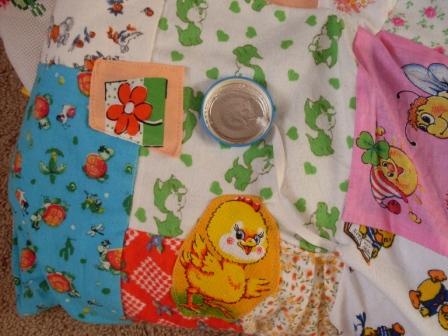 Игрушка вторая - самодельное "детское" зеркальце. Сделано так: на крышечку из-под детского питания, внутрь приклеивается фальга. Сбоку делается резинка, пришивается к коврику.