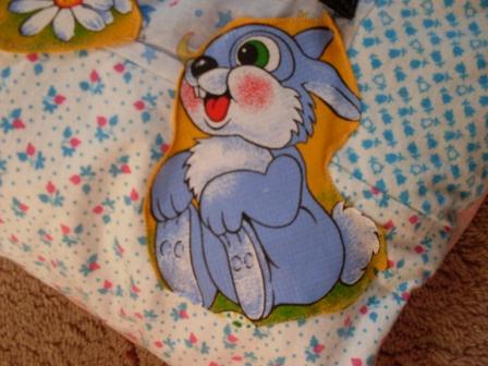 ) , застегивается на пуговицу. Внутри на резинке сидит зайчик. Он сшился из фланелевой ткани, внутрь набивался синтепон и погремушка, глазки и носик - пуговки, усы изтонких приклееных проволочек и кусочка синтепона, так же на резинке.