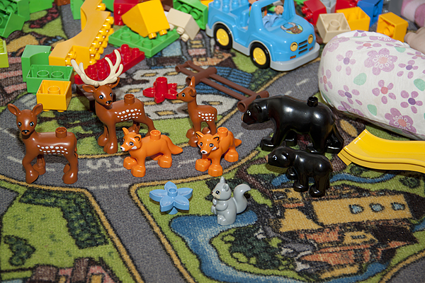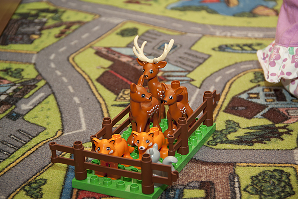 В наборе 105 деталей (он самый большой из новой серии "Лесные животные"). Из них 8 животных - семья оленей в количестве 3 штук, семья мишек гризли, семья лисичек и белочка.
