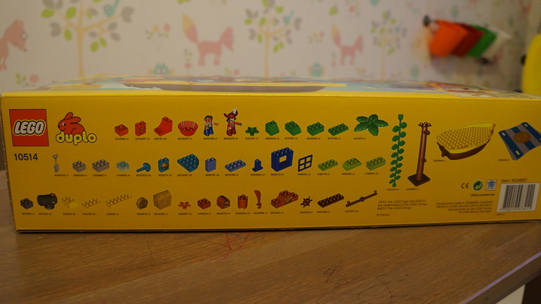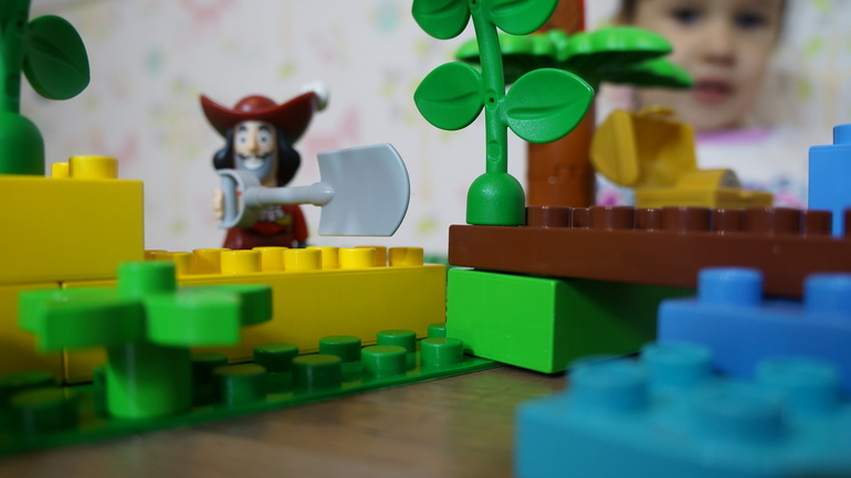 Вот его состав. Тут можно найти и окошко каюты, прозрачный кубик- волна, элементы голубых кубиков для создания моря, серые кубики - камни, много элементов для создания необитаемого острова и даже сундук с сокровищем. Из минифигурок в набор входят только Джейк и Крюк. А так же кубик с изображением попугая.