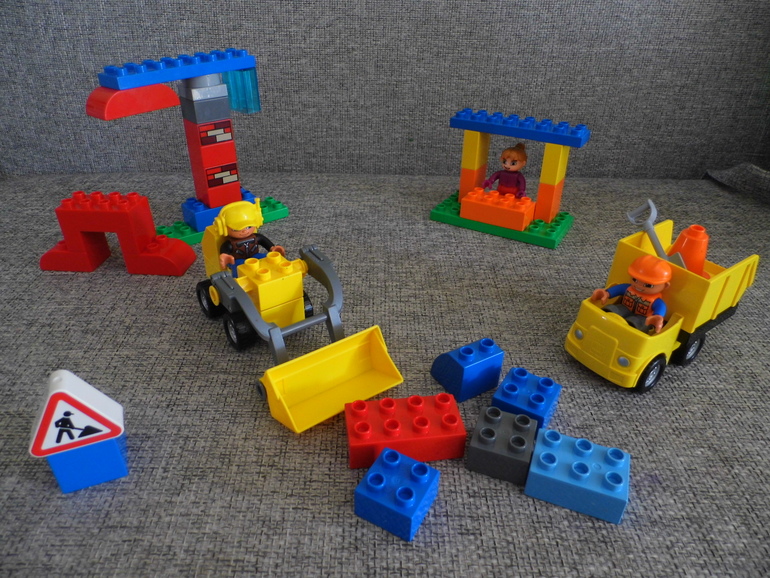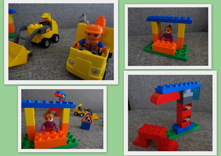 Видите, на заднем плане у нас девочка не из Лего? Нам очень нужна была продавец в киоск, а других наборов с Лего у нас же не было ещё. Пришлось брать куколку из другого конструктора. Наша девочка продает на стройке булочки и кофе, чтобы строители не умерли с голоду. Здесь наша стройка видна поближе.