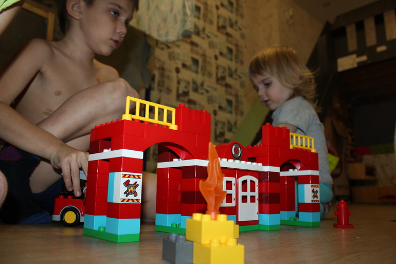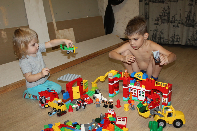 Благо там все настолько подробно и ясно нарисовано, что даже двухлетний ребенок разберется. Деталек много, больше ста точно. Хватило всем. Ясен пень, что семилетний Даня соображает шустрее, чем четырехлетки и двухлетний Степа. И большую часть собрал он.