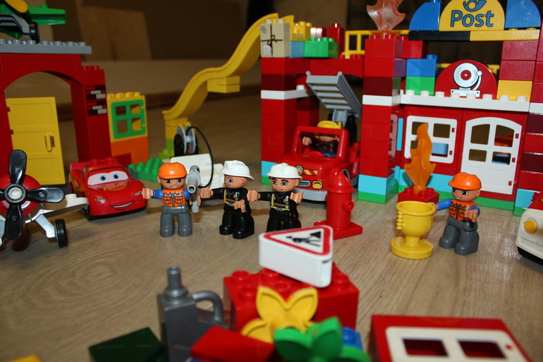 Спать пошли тоже с машинками из наборов. Каждый со своей- еле поделили, кто с какой))) Собственно с понедельника все игры крутятся вокруг нового набора. Старшие дети приходя со школы и садика мчатся в детскую проверять, на месте ли их пожарная станция) А уж пока их нет, отрывается младший- привлекает меня к тушению и поджиганию, не могу сказать, что я сильно против. У меня в детстве подобных игрушек не было( Были совсем крошечные наборчики лего из "Волшебных сундучков милки вэй" (может тут есть мамонты, которые их помнят?)) и все. Поэтому сейчас доигрываю с детьми) Ну про мужа я вообще молчу: кто в детстве не мечтал стать пожарным?))))