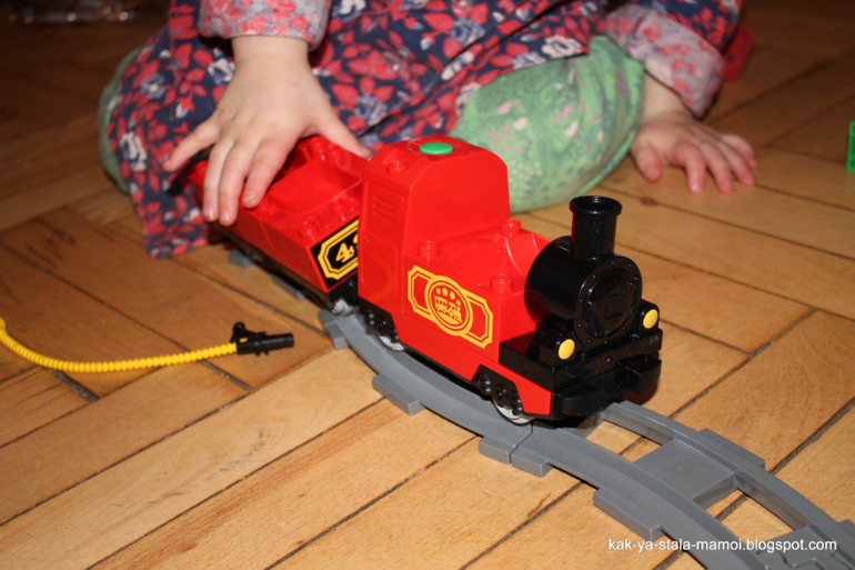 Примечательно, что еще за несколько дней до получения Lego Duplo 4 Алиса собрала простой поезд, каждый вагончик был нагружен какими-нибудь Lego-вкусностями. Теперь вот, новые технологии осваиваем.