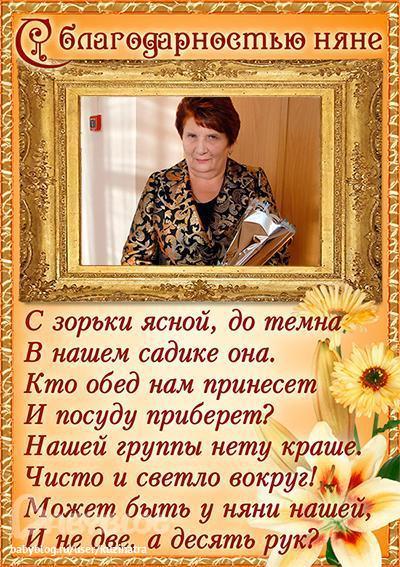 У Вас, конечно, самый труд тяжелый!Хотим сказать, что дети нынче в школуПойдут, привитые к порядку Вами!Натруженными женскими рукамиПорядок наводили день-деньской!И воспитателя подстраховать порой,За группой присмотреть Вам приходилось,Желаем, чтобы в радость Вам трудилось,Чтоб благодарным оказался труд!Пусть Вас не воспитателем зовут,Пусть Вы его помощник только,Но Вам забот хватило столько,Что нам ваш труд не оценить,Сумеем вряд ли Вас забыть,Здоровья Вам и счастья впредь,Пылать в работе и гореть!