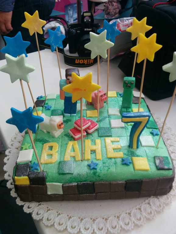 Торт мы приносили с собой, делала как всегда наша любимая бабушка-мастерица, Ване сейчас нравится игра Mincraft он и заказал этот торт, всем очень понравился.