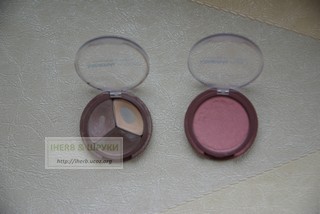 Эту декоративную косметику я купила три ( ! ) года назад. Как видно из сегодняшнего состояния, тенями я пользуюсь активно, практически заюзала их до дыр :) А румяна всё такие же нескончаемые.