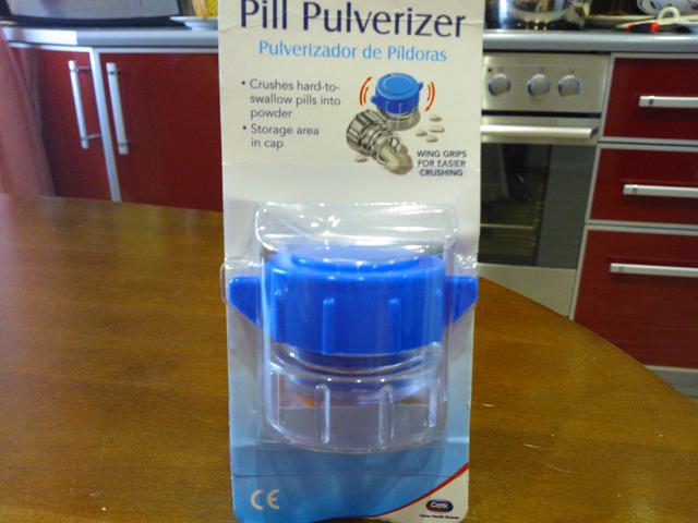 Его конструкция проста: прозрачная баночка с резьбой из прочной пластмассы и крышки-винта, в которой находится контейнер для хранения таблеток. Таблетку необходимо поместить на дно прозрачной пластиковой баночки, вставить в нее винт-измельчитель и закрутить его по часовой стрелке. Получаем таблетку, стертую почти в порошок! Все очень просто и быстро!