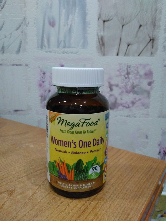 Итак, MegaFood, Women's One Daily, Whole Food Multivitamin & Mineral, В стеклянной баночке содержатся 30 таблеток, в день принимать по 1 штуке.По размеру таблетки довольно крупные. На вкус солоноватые, пахнут приправой. Состав полностью натуральный: витамин С из апельсина, фолиевая кислота из брокколи и пр. Добавлен витамин К, его в мультивитаминных комплексах редко встретишь. Суточные дозировки витаминов в составе нормальные т.е не зашкаливают за 1000 %. Из положительных моментов за время приема могу отметить усиленный рост ногтей. Да, и бодрости в целом прибавилось.