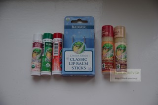 В набор Badger Company, Limited Edition, Organic Classic Lip Balm Sticks, 3 Lip Balm Sticks представлены следующие ароматы: чайная роза, мята, корица. Ну, что такое мята в гигиеничках я представляла, а вот запахи чайной розы и корицы звучали интригующе. Состав у всех трех помад одинаково хороший: не содержат нефтепродуктов, искусственных красителей, ароматизаторов и подсластителей; сертифицированны USDA органик;основа из оливкового масла и пчелиного воска, добавлены экстракт облепихи, шиповника, алоэ. По уходовым качествам мне понравились: питают, увлажняют, не липкие. А вот с запахом - разочарование. Я то на запах розы рассчитывала, а оказался запахчая. Такой бодрящий, на любителя. Корица тоже на корицу в моем понимании не похожа. По размеру помадки не очень большие, меньше наших Нивеевских. Выкручиваются хорошо, при комнатной температуре становятся мягкими и могут отломиться, поэтому сильно выкручивать не рекомендую.