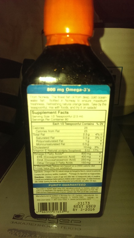 Когда ребенок был маленький и не умел глотать капсулы, то покупала жидкий рыбий жир Carlson с апельсиновым вкусом. Запах рыбный чувствуется, но терпимо. Давала в обед и сразу хлебом/супом заесть :) Он с 4х лет, открытую бутылку хранить в холодильнике 90 дней.