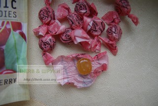В пачке 100 гр. конфет, каждая в индивидуальной упаковке. Это удобно, можно положить с собой в сумочку, закинуть горсточку в рюкзак ребенку в школу. Сами конфеты твердые, при рассасывании образуются внутри полости - можно травмировать язык. На вкус мне совершенно не понравились: они просто сладкие и все, без кислинки. Если не знать, что на пачке написано Вишня, то по вкусу об этом и не догадаешься. У меня вообще было сначала ощущение, что мыло полизала :) Муж тоже сказал - фигня, наши Барбариски вкуснее.