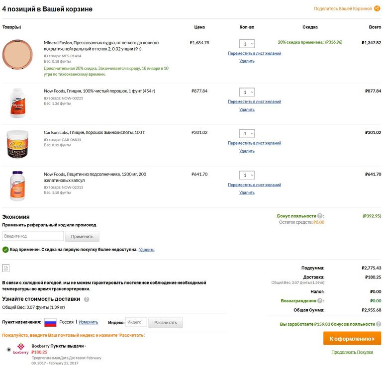 Например, если покупатель заказывает тяжелые по весу товары (такие как протеин, большие емкости с жидкостью и т.д.), скорее всего, при совершении покупки будет необходимо оплатить расходы по доставке. На менее тяжелые по весу товары (добавки, товары для душа и красоты и т.д.) стоимость доставки может быть очень низкой и даже бесплатной. Тем не менее, бесплатная доставка не гарантируется, как это было ранее.