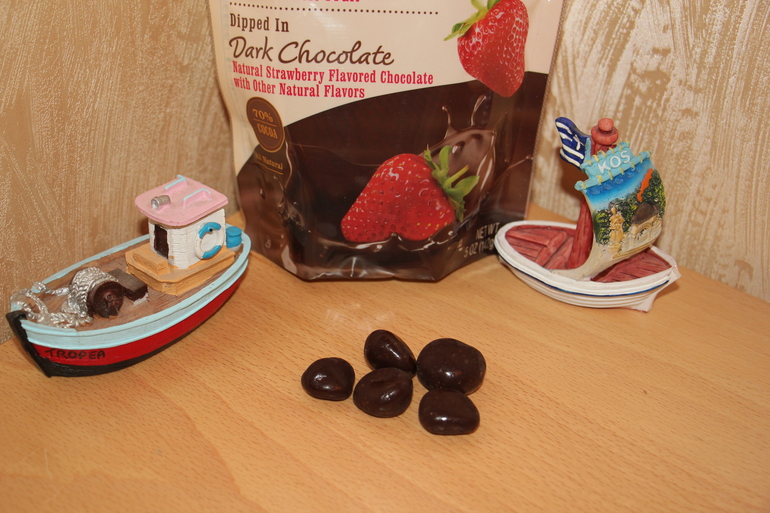 Клубника в шоколаде(содержание какао 70%), какой потрясающий аромат, когда открываешь упаковку. Удивительно, как клубника и шоколад гармонично дополняют друг друга, нет излишний сладости, чувствуются и шоколадные аккорды, и сама клубника очень отчетливо. В упаковке достаточно много ягод, но пачка улетела в момент. Ягодки примерно одного размера, но попалось в упаковке и несколько крупных, даже в форме сердечка. Следующая на очереди вишня.