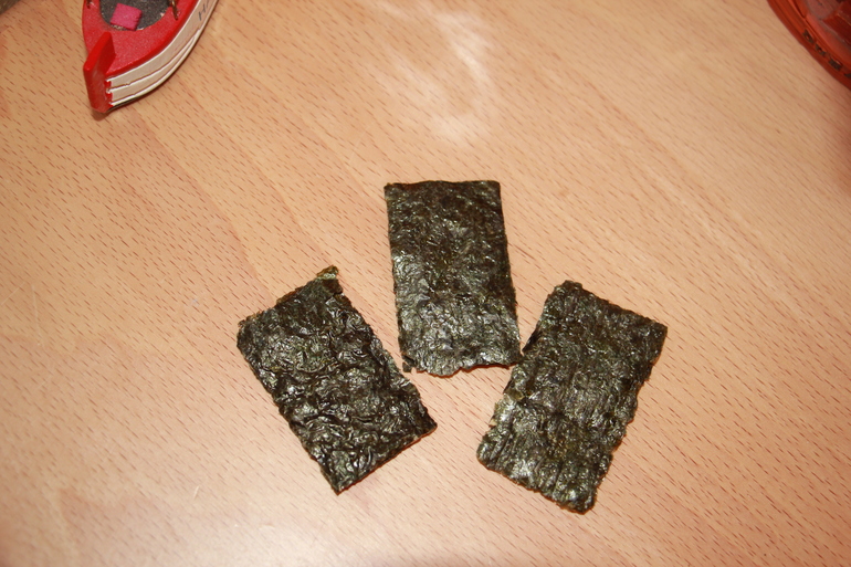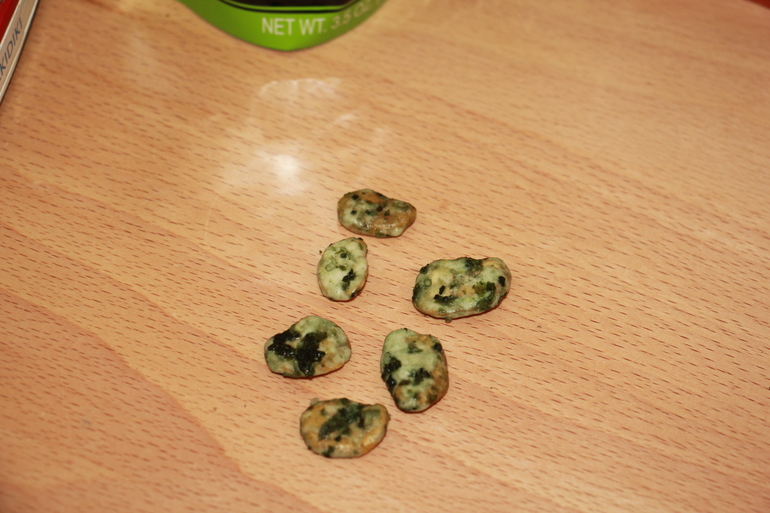 Небольшие прямоугольные брусочки, сверху совсем пресные, при раскусывании появляется сладость и соль. Приятные, но на любителя этих самых водорослей. Второй раз брать не буду.