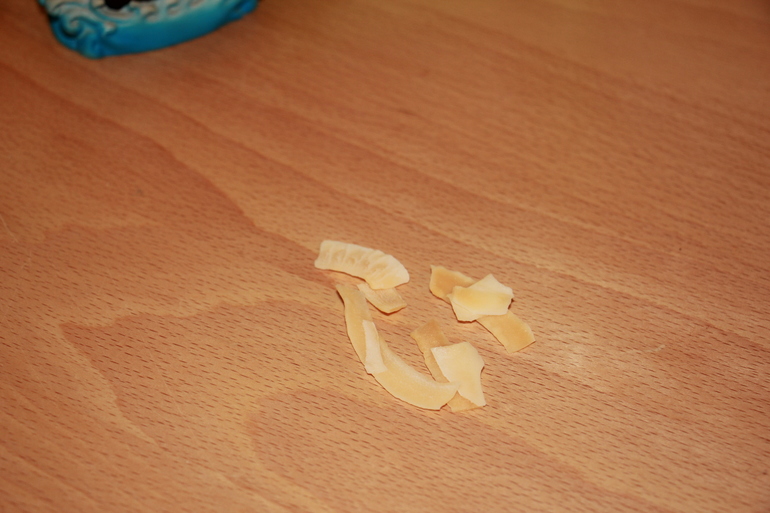 На вид - это обычные, золотистые полосочки, похожие на кальмара, очень хрустящие.