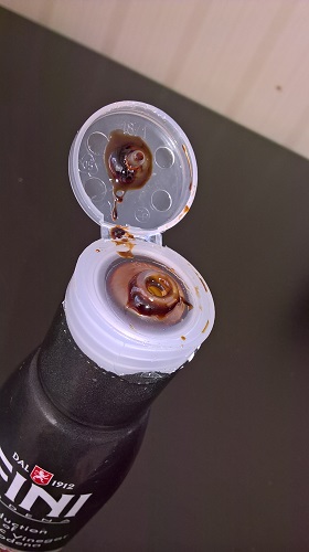 У бутылочки очень тугая откидывающая крышка, открывать приходится с усилием и вероятностью сломать ногти ))) поэтому до щелчка крышку не закрываю.
