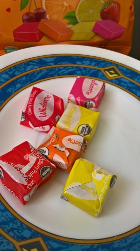 Внутри такие жевательные квадратики, всего 12 штук: клубника, апельсин, лимон, вишня.