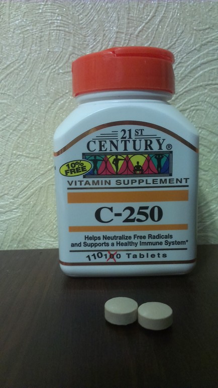 Другой витамин Ц 21st Century, C-250, 110 таблеток купила только взрослым. Состав обычный, но работающий. Желудки переносят его хорошо. Дозировка выше, чем у первого. Здесь 417%.Пока всё радует. Не болеем. А апельсиновенькие грызём как конфеты.
