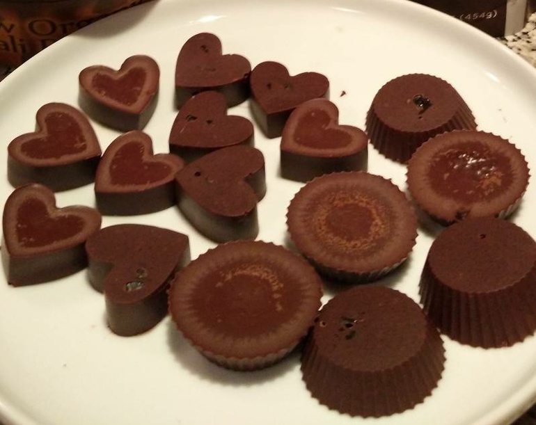 2. Шоколадные конфеты: 50 гр какао масла, 12 чайных ложек какао порошка, чайных ложек тростникового сахара (лучше заменить на жидкий подсластитель, т.к. сахар не до конца растворяется), 5 плодов чернослива (начинка на ваш вкус). Растапливаем на водяной бане какао масло, затем добавляем подсластить, какао порошок. Всё перемешиваем до однородной консистенции. Предварительно замоченный в горячей воде чернослив нарезаем на небольшие кусочки и раскладываем по формам. Заливаем готовым шоколадом, даём остудиться в течение 30 мин. и ставим в холодильник на 2 ч.