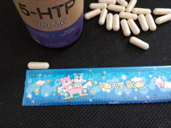 Капсулы компактные - в длину всего 1,5 см и худенькие:) Глотаются легко, что важно для меня. В одной капсуле содержится 100 мг L-5-гидрокситриптофана.