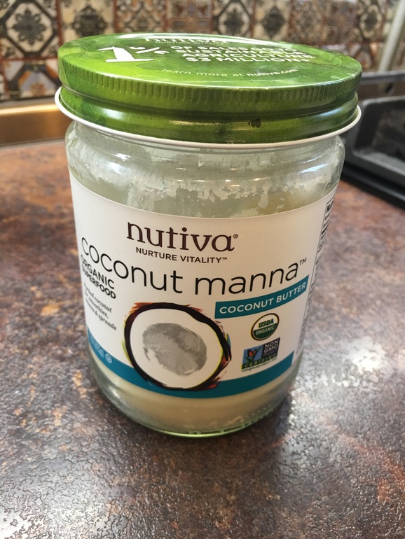 Из кокосовой манны делала конфеты, добавляла орешки. Сверху в банке кокосовое масло (оно застывшее, белого цвета). Потом идёт сама манна. Вкусная даже сама по себе, только много не съешь, уж больно специфическая.