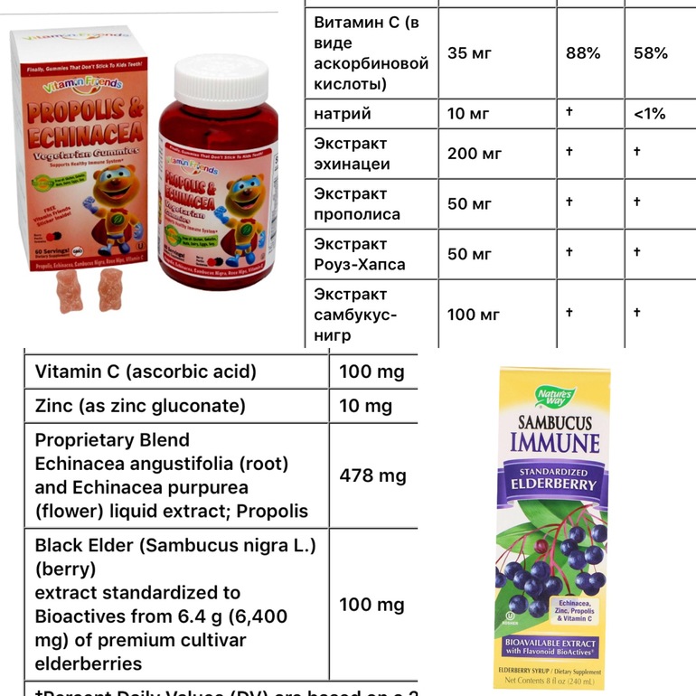 витамины и БАД для детейДостойная замена!Чуть дороже! Но эффективно не меньше.Главное в мишках это эхинацея и бузина.Посмотрите содержание этих веществ в сиропе Самбукус. Доза на 10 мл. рассчитана. Делим на 2 и получаем в 5 мл то же содержание.