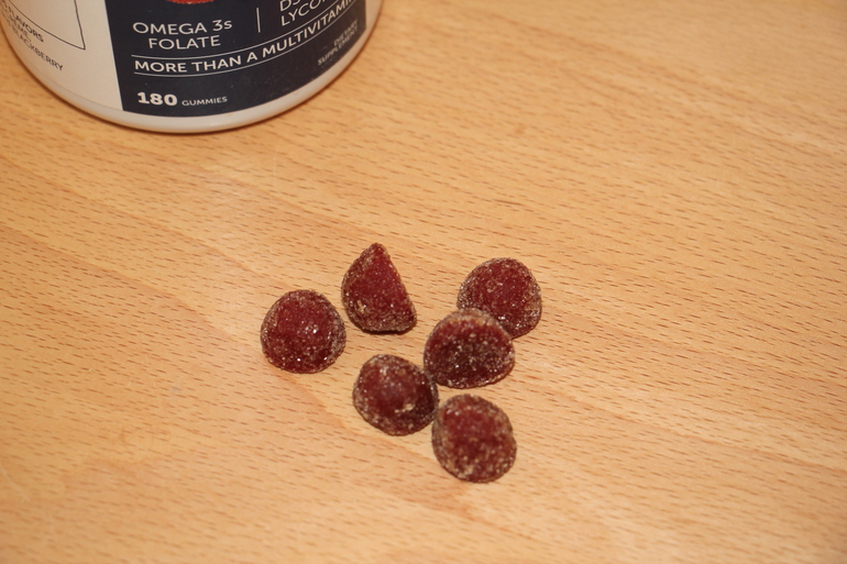 Очень люблю эту фирму и доверяю ей. Обычно брала детские витамины, но тут и мужа захотела побаловать, хотя по цене, конечно, выходит дорого. Состав очень хороший. Помимо полного комплекса витамин, есть омега, витамин К, холин, ликопин и коэнзим. Сами конфетки очень вкусные, обсыпанные сахаром, жуются хорошо, к зубам не пристают.