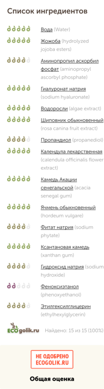 Для увлажнения, регенерации, омоложения кожи, улучшения её структуры и против воспалений добавлены Гиалуронат натрия, водоросли, шиповник, календула и ячмень.