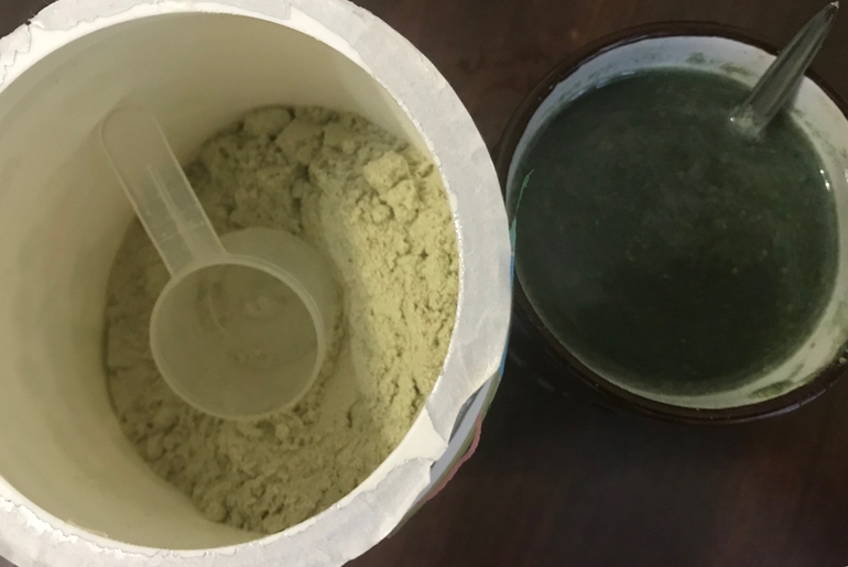 смесь представляет собой светло-зеленый порошок , богатый питательными веществами, витаминами и микроэлементами. Также содержит пробиотический штамм LactoSpore Bacillus coagulans. В цилиндрическом бочонке аккуратно закопан совочек для разведения смеси.