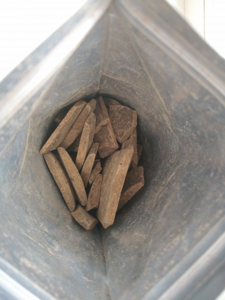 5) Пасту охлаждают и упаковывают в брикеты 100% чистого, несладкого шоколада.