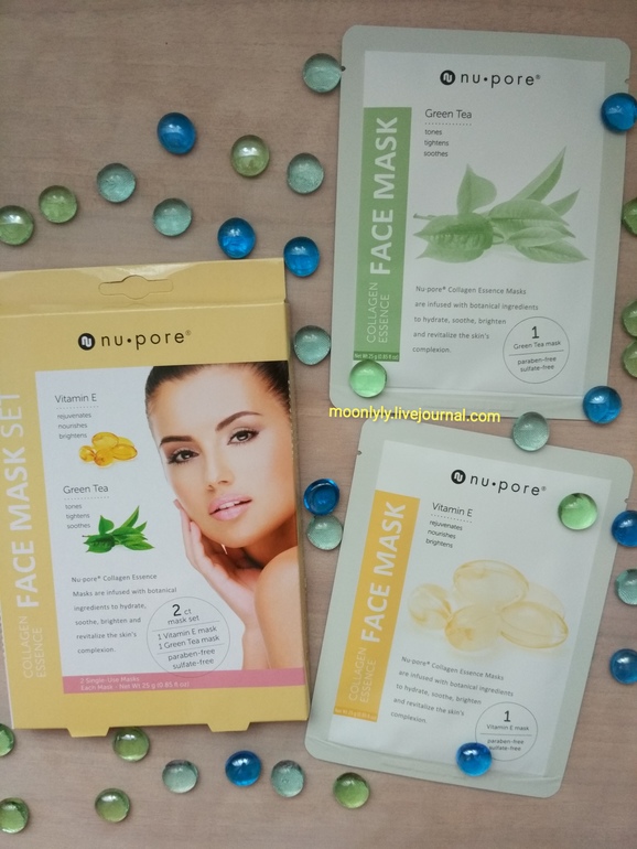 Набор Nu-Pore одноразовых масок для лица, состоящий из 2 штук с различными наполнителями: Витамин Е и Зелёный чай. В составе нет парабенов и сульфатов. Зато обе маски обогащены гидролизованным коллагеном и гиалуронатом натрия.