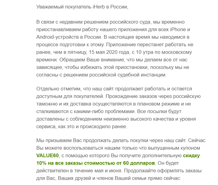 Для поддержания бодрости духа покупателей Айхерб дал промокод VALUE60 на 10% скидку для заказов 60 долл.