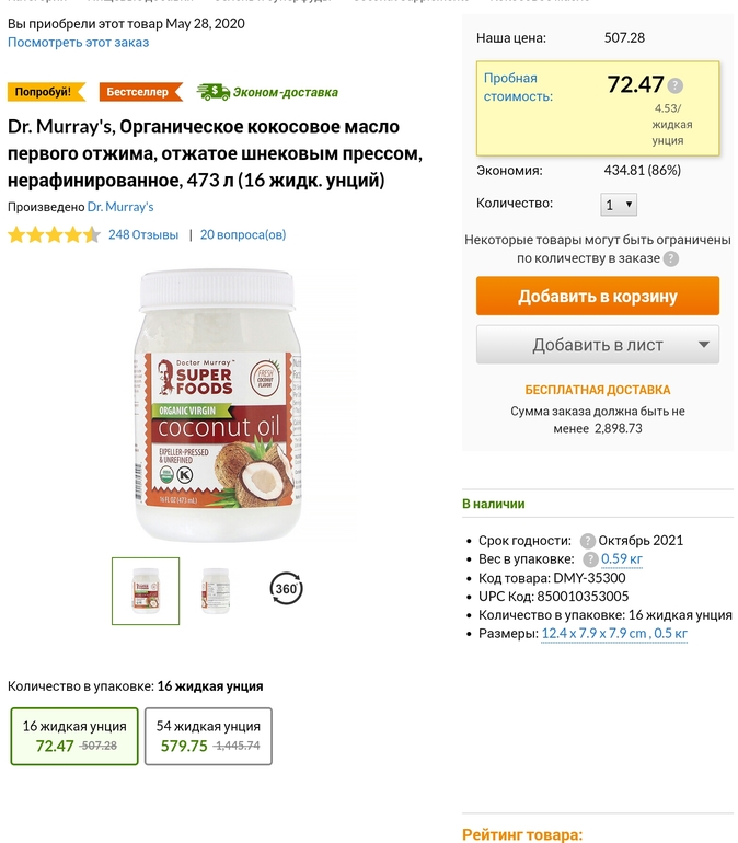 продукты питания и специиУспела заказать сегодня со скидкой это масло за 72 рубля! Вместо 500!
