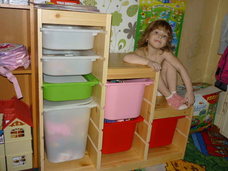 мы купили труфаст лесенкой. считаю, стоит своих денег. ребенку нравятся ящики (цвета она сама выбирала), и игрушки теперь по местам, и раскраскам-фломастерам место нашлось. можно взять еще крышки, чтоб мягкие игрушки закрыть от пыли