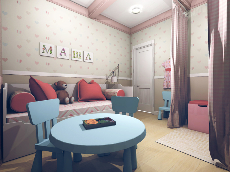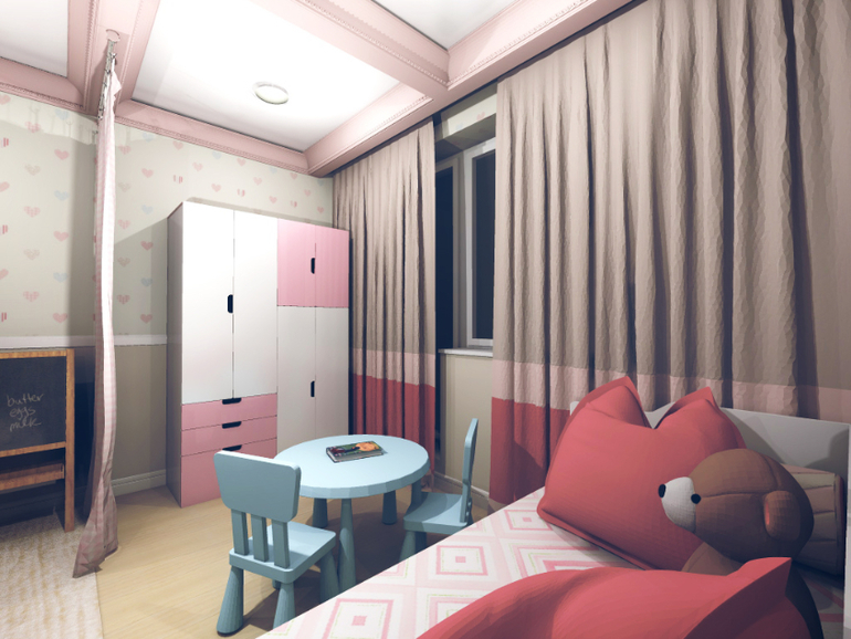 Это игровая зона, закрывается шторами, чтобы можно было закрыться и поиграть в домик, в шторах планируется сделать окошки. Когда девочка подрастет(года через 3-4), шторы снимут и переставят в этот угол кровать, а у окна будет парта. Таким образом мы мобильно зонируем комнату.