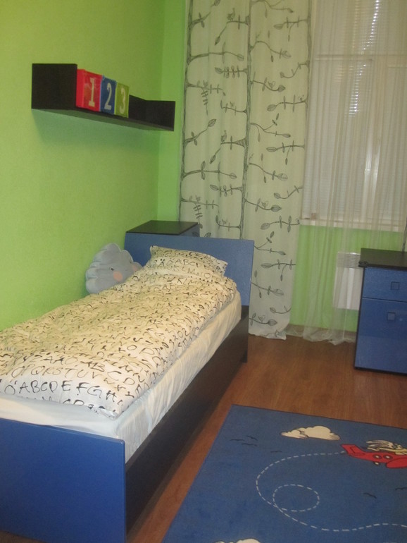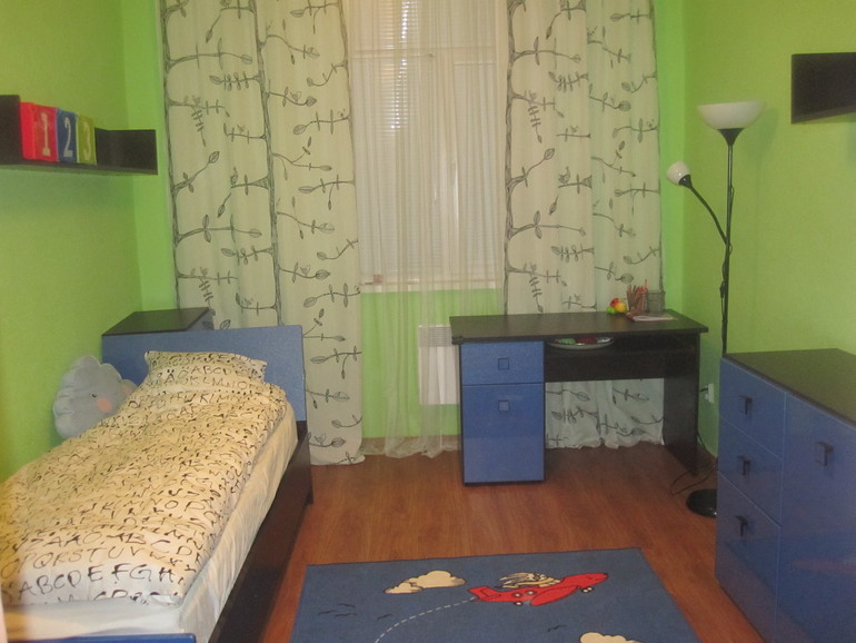 На мой взгляд, много синего цвета, я бы выбрала более яркий коврик и в его же цветовой гамме обыграла текстиль (шторы и покрывало на кровать).Может быть бы еще каких-нибудь картинок на стены.