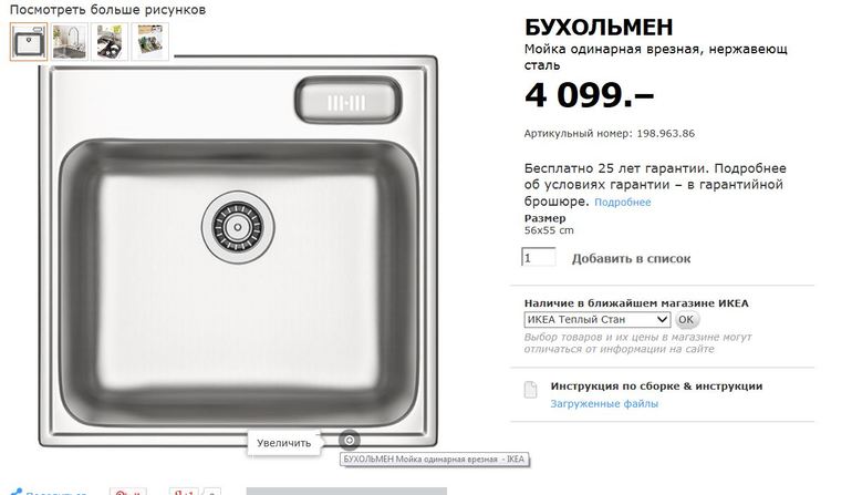 Мы сначала по совету икеевского дизайнера такую же мойку выбрали, дождались их же установщика и он показал, что если такую мойку ставить в краевой ящик шириной 60 см, то остается 1 см — а это ненадежно. По быстрому, пока установщик собирал другие ящики, сгоняли в ОБИ и взяли похожую, за тысячу с копейками, наружный размер 50х50 см, внутренний 36х36 см, слив подошел от икеевской. До края столешки 7,0 см остается.
