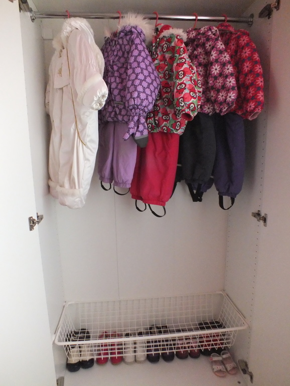 думала, что полки идут в комплекте, придется дозаказывать три штучки над выкатной сеткой, а в другом шкафу решила только штанги повесить, люблю все на вешалках чтоб было. Повесили их на разный уровень, под разный размер одежды