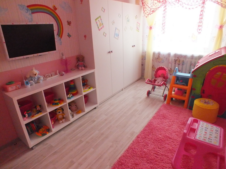 На самом деле, потолок и обои внизу бледно розовые, комната в пастельных тонах получилоась, яркое пятно это ковер. Когда фоткаю на телефон, он передает почти точный цвет, бледно розовый. Но решила сфоткать на хороший фотоаппарат , с режимами не разобралась, поэтому цвета аполучились очень насыщщеннее и ярче, чем есть на самом деле.